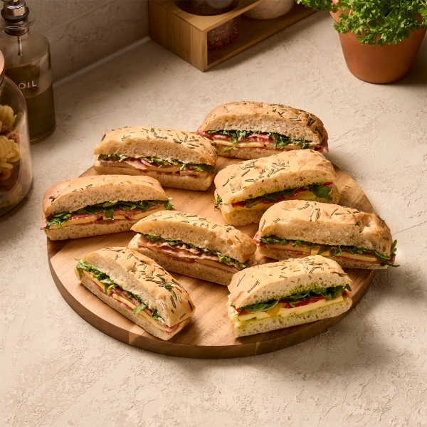 Product legal description 8 Piece Focaccia sandwich platter consisting of 4 quarters of salami, Mozzarella and rocket, 2 halves of chicken Caesar and maple bacon and 2 halves of Mozzarella, roasted vegetables and basil pesto on rosemary and rock salt focaccia