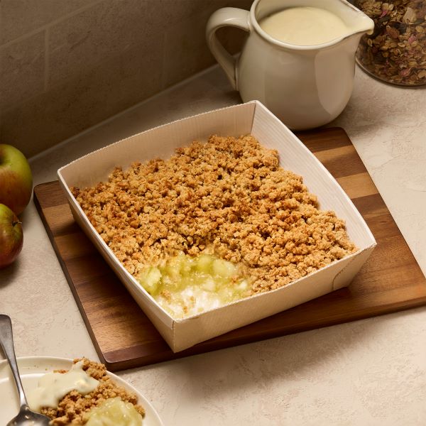 Oat and apple crumble made with three British apples: tangy Bramley, aromatic Gala and sweet, rich Golden