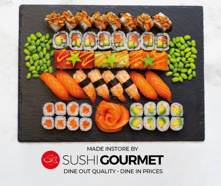 Product legal description Salmon sashimi, salmon nigiri, salmon maki, a selection of vegetable california rolls topped with either salmon, tuna, crispy fried onions and all with spicy mayo, prawn nigiri, breaded prawn california roll with spicy mayo, and an avocado and surimi maki